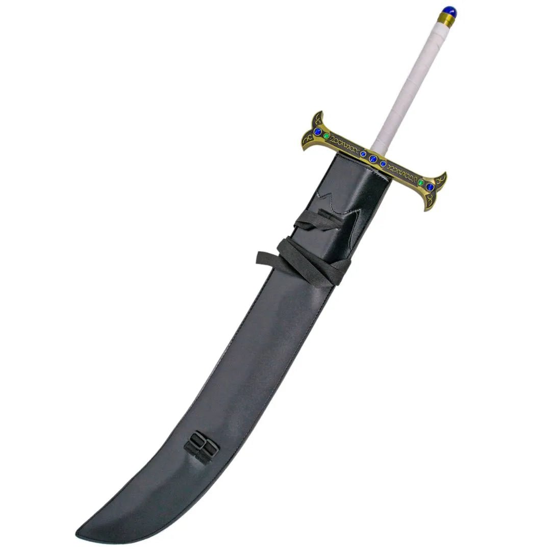 Cada detalle de esta espada habla de poder y precisión. Su hoja de acero inoxidable no solo resalta por su acabado impecable, sino que está pensada para durar. El diseño en forma de cruz, su guarda extendida y la ligera curvatura evocan el estilo imponente de Dracule Mihawk. No es solo un homenaje visual, es una pieza equilibrada, con centro de gravedad optimizado para un manejo realista y seguro.