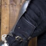 Los hombros de férula negra de Epic Armoury son un conjunto de dos simples cantos rodados. Las rocas cuentan con una placa de metal sólido con una forma contorneada para girar y absorber los golpes en el brazo. Las rocas se sujetan con correas de cuero alrededor del bíceps, así como un cordón en el hombro que se adhiere a una coraza o gambesón. A lo largo de la parte superior del hombro están adornados con un interruptor de metal festoneado y cuero negro.