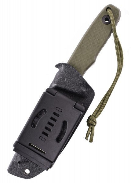 Las carcasas del mango del cuchillo se sujetan con los llamados tornillos de cadena y se pueden abrir fácilmente con la ayuda de una llave Allen M6 o una llave Allen para limpiar el «TRI» si es necesario. La funda Kydex ultrarresistente y resistente a la intemperie no deja nada que desear. Está diseñado para ser compatible con Molle y tiene un sistema de ensamblaje múltiple en la parte posterior para llevar el cuchillo, por ejemplo. B. en la mochila o en el cinturón (horizontal / vertical). Un hueco para el pulgar / una rampa para el pulgar pronunciado y ergonómico en la parte superior permite que el cuchillo se deslice cómodamente fuera de su funda en cualquier situación.