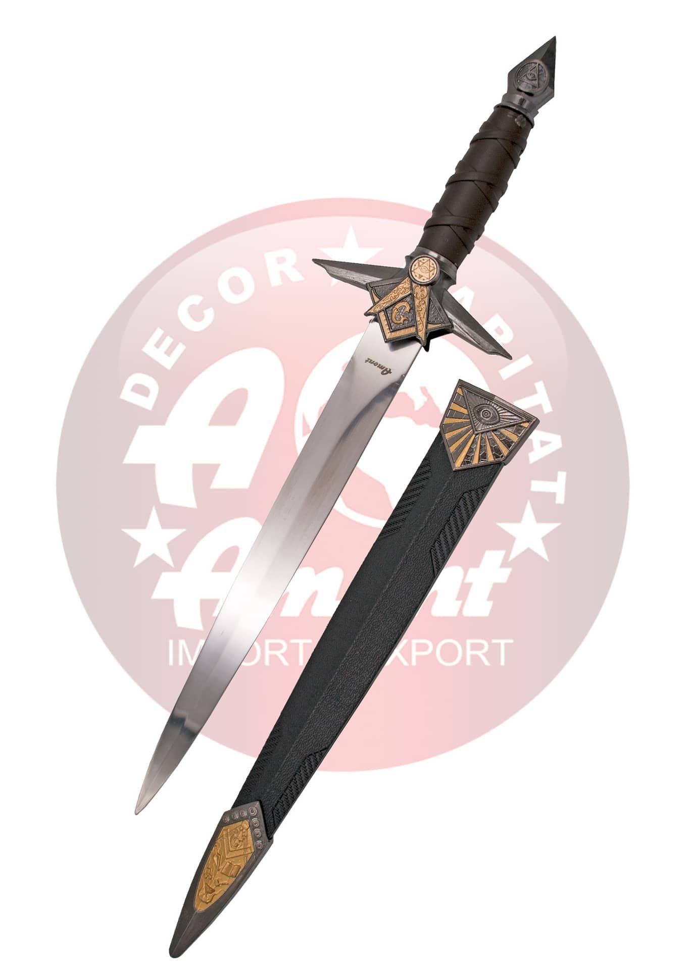 Daga Masónica S0297, el pomo está acabado en níquel y el mango plástico marrón, la guarda acabada en níquel con detalles masónicos. El tamaño total es de 40 cm con hoja de acero. La vaina está acabada en plástico negro con los detalles metálicos en níquel con detalles masónicos. Ref. S0297