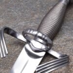 Hecho para ser igualmente útil para la ofensiva o la defensa, tiene una hoja larga, gruesa y ancha que es lo suficientemente resistente como para oponerse a la espada más pesada, pero sigue siendo capaz de perforar la tela más gruesa, el cuero o incluso una cota de malla o una placa liviana. Equipado con quillones extra resistentes hacia abajo y un generoso anillo lateral, ofrece una excelente protección para la mano y el antebrazo contra ataques de espada y daga y es muy útil para atrapar y atrapar hojas también. Se maneja fácilmente en cualquier dirección y con gran velocidad, viene con un mango envuelto en alambre de época correcta y un fuerte pomo de acero que fácilmente se dobla como un arma de impacto por derecho propio.