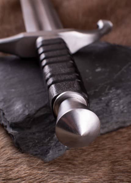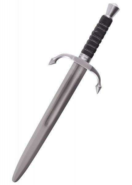 Aunque la daga de lucha de exhibición de bajo costo que ofrecemos aquí no es una réplica exacta de un original histórico, tiene las características típicas de una daga de parry renacentista tradicional. La hoja completa sin afilar hecha de acero de resorte EN45 ha sido endurecida, templada a aprox. 48 HRC, y está atornillada a la perilla (invisible). Una amplia ranura hueca corre en el medio sobre aproximadamente la mitad de su longitud. El folleto consiste en una sección de mango de cuatro lados con núcleo de madera y cubierta de cuero negro, que está enmarcada por una perilla de enchufe y un protector de mano fuerte de aprox. 12 cm de ancho hecho de acero. La pieza de protección doblada hacia la cuchilla se cierra con extremos cónicos de forma cónica.