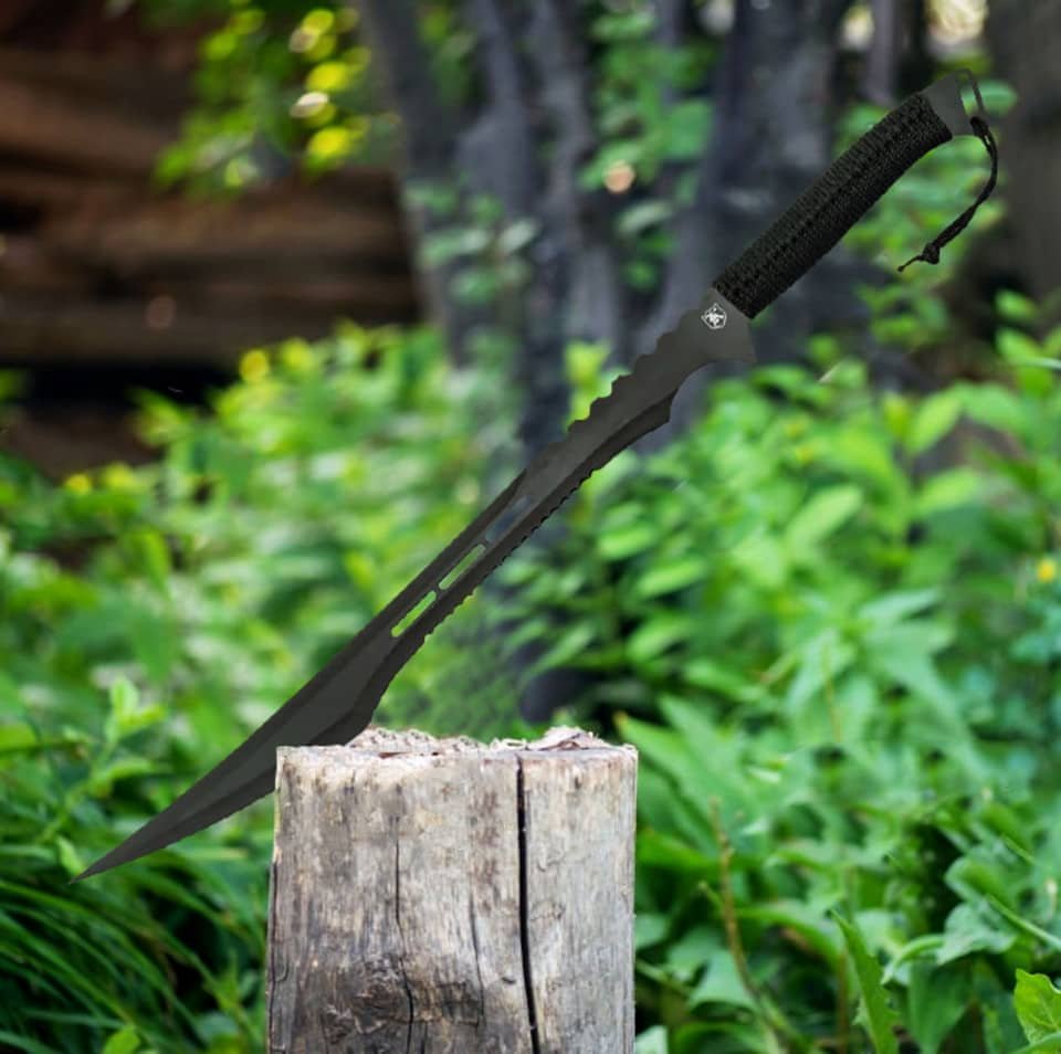 La espada no solo es un accesorio estético, sino que también cuenta con cortes elegantes, dientes de sierra y una punta penetrante. Además, se entrega con una funda de nailon incluida para garantizar su resguardo y facilitar su transporte.