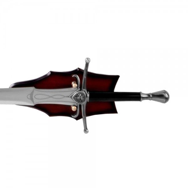 Esta espada de fantasía ornamentada está inspirada en las espadas que utiliza el brujo en sus aventuras. Con una hoja de acero impresionante de 810 mm de longitud y un peso de 1660 g, esta espada es una pieza impresionante que no querrás perderte. La empuñadura de metal y el mango de metal y plástico hacen que agarrar la espada sea muy cómodo y fácil. Además, un soporte de pared de madera viene incluido para que puedas exhibirla en tu casa u oficina.