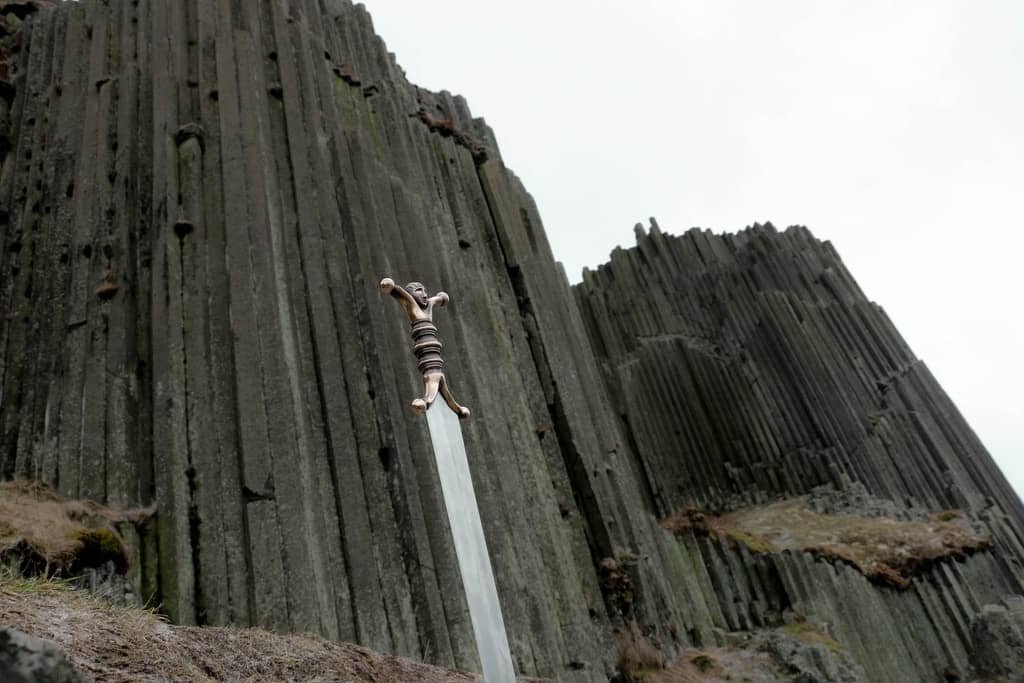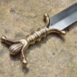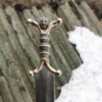 Reproducción de una espada celta con empuñadura antropoide, descubierta en 1902 en North Grimston, distrito de Ryedale, North Yorkshire, Reino Unido. La espada fue encontrada en la tumba de un guerrero celta , junto con un escudo, una segunda espada y un hueso de cerdo ( Hull and East Riding Museum ). Espada decorativa con acero forjado.