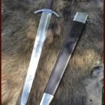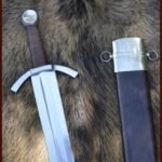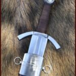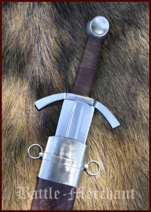 – Espada medieval de una sola mano con perilla redonda, mango de madera envuelto en cuerda de cuero y barra de barrería en contraste.