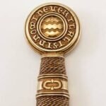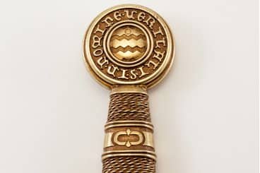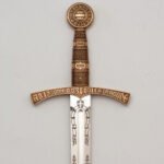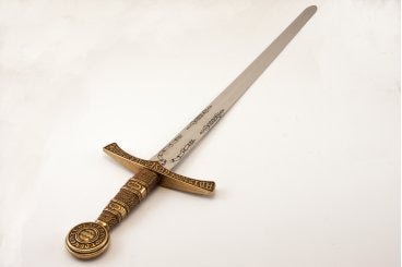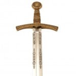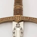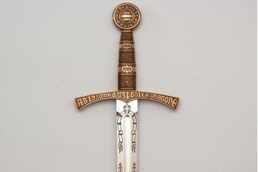 La espada presenta una inscripción en latín vulgar en su cruz y pomo que dice: «Custodiada por un dragón que no duerme, en nombre de la verdad». Esta inscripción en el pomo de la espada es una muestra de la devoción religiosa de los caballeros, que combinaban su fe con su habilidad en el combate cuerpo a cuerpo.