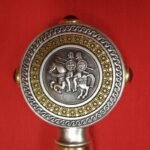 La empuñadura de la Espada Templaria Damasquinada aparece decorada con detalles en oro damasquinado y está fabricada en plata. El puño hecho en terciopelo granate le da la sensación de ser legitimamente antigua, mientras que el pomo con sello de la Orden señala su origen y la Cruz con la inscripción de los Caballeros Templarios en latín «SIGILUM MILITUM XPISTI» (Sello de la Milicia de Cristo), muestra claramente su afiliación con la noble causa de la Orden.