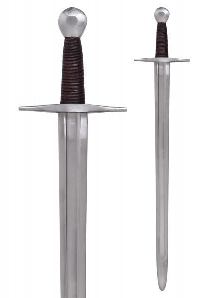 El mango de madera de la espada está muy bien envuelto en una correa de cuero marrón, lo que le da una apariencia clásica y elegante. La espada también cuenta con una perilla de acero, una barra de protección recta y una pieza de guardia de aproximadamente 16,5 cm de largo. Las pinzas cilíndricas de la pieza de guardia se estrechan desde el centro hasta los extremos, y los bordes de corte sin afilar son particularmente gruesos, lo que garantiza una mayor resistencia.