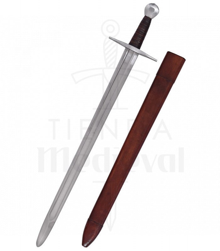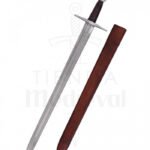 Esta espada de una mano viene con una funda de madera marrón/cuero genuino para poder transportarla con seguridad y estilo. Sin embargo, es importante destacar que esta espada es más adecuada para luchas de espectáculo que para luchas reales, ya que los bordes de impacto son romos y la punta es redondeada. Pero si participas en luchas de espectáculo, esta espada es perfecta para ti, ya que es resistente y duradera.