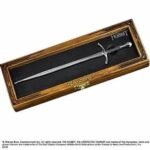 Original réplica en miniatura de la espada Glamdring de Gandalf el Gris tal y como aparece en El Hobbit: Un Viaje Inesperado (2012) del director Peter Jackson. Fabricada en acero de alta calidad, puedes utilizarla como abrecartas. Se presenta en una elegante cajita de madera con tapa de cristal, perfecta para regalo. Producto Oficial y Licenciado. Dimensiones aproximadas: 23 cms.