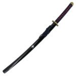Esta katana destaca por su hoja de acero negra con acabado satinado, que resalta su aspecto imponente y sofisticado. La vaina lacada en negro con detalles plateados complementa su estética, mientras que su mango encordado en azul marino con imitación de piel de raya en rojo evoca la esencia del espíritu combativo de Erza.