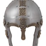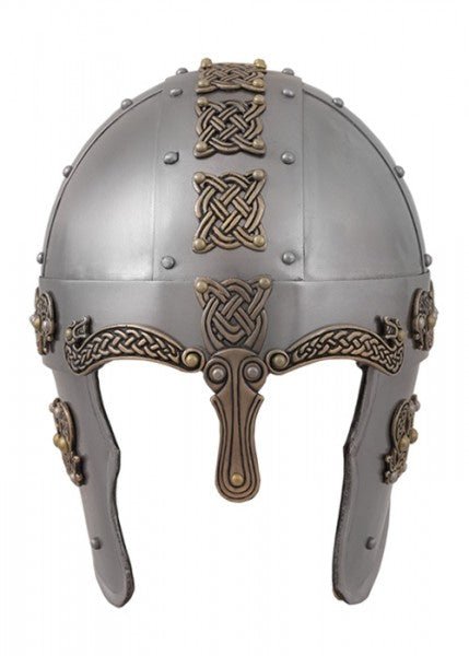 Casco del viejo nórdico del dragón El casco delantiguo nórdico del dragón corresponde a un casco nasal, con una concha de casco en forma de media concha, el característico protector nasal y mejillas adicionales. La parte delantera, la corona y las mejillas están decoradas con elementos de nudo de color bronce. La incrustación de cuero se puede ajustar individualmente para el usuario.