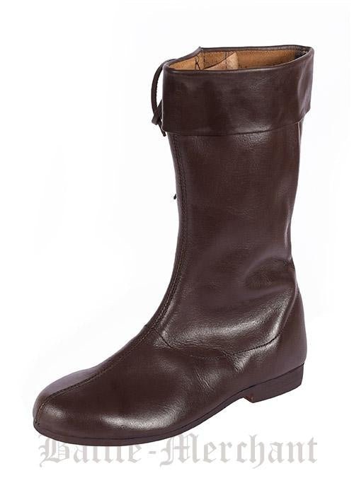Botas largas con cordones, color marrón oscuro. Botas robustas de estilo alto a moderado, con cordones de cuero en los laterales y puños. Tales botas fueron ampliamente utilizadas desde aproximadamente 1200 a 1450 AD.