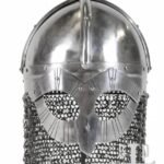 Esta réplica está forjada a mano en acero de 2 mm. La campana redonda del casco, los cierres (una diadema, una corona y una banda que va de oreja a oreja) y el protector facial están conectados entre sí mediante remaches de acero. El interior ennegrecido está provisto de una incrustación de cuero ajustable unida a la campana del casco con remaches, y la correa de la barbilla hecha de cuero de aproximadamente 1 mm de grosor se cierra con un cordón.