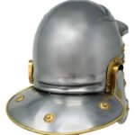 – Material: acero con herrajes de latón, forro de cuero sintético, correa para la barbilla de cuero
