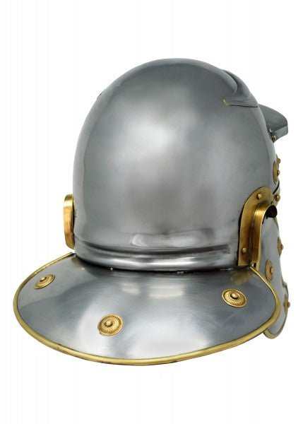 Este casco de soldado romano (también conocido como Galea o Cassis ) es una réplica simplificada a escala de un casco llamado Imperial Galo Weisenau de los siglos I / II d.C. . Los rasgos de identificación característicos de este tipo particular de casco fueron (entre otras cosas) las cejas pronunciadas, la banda para la frente y los rosetones decorativos circulares de latón. Los verdaderos soldados romanos nunca abandonaron el campo sin sus cascos. El casco pertenecía a armadura ( lorica ), escudo ( scutum ) y espada corta ( gladius) para equipar a cada legionario valiente.