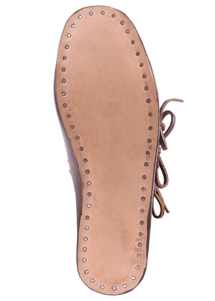 Reconstrucción sólida de los zapatos de la Edad Media después de los hallazgos en Londres, alrededor del año 1380 dC Los zapatos están cada uno entrelazado en el empeine con tres cordones.