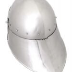 Nuestro muy fiel reconstrucción de una Schaller alemán combina tanto la representación auténtica y la máxima seguridad, El original, probablemente se remonta a un armero Nuremberg y se plegará a 1480, su visera es bloqueable por un candado remachado lateralmente en el escalón más bajo.