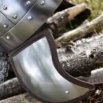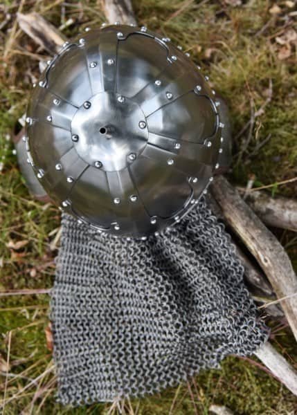 Nuestra versión está especialmente diseñado para la pelea de exhibición y por lo tanto muy robusto, de chapa de acero de 2 mm de espesor, tiene dos piezas de mordaza de acero, con bordes de cuero y el interior cubierto la mejilla guarda el cuero atado correa de la barbilla. Además, el casco tiene una de malla de cadena.