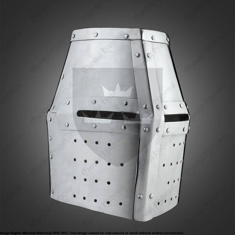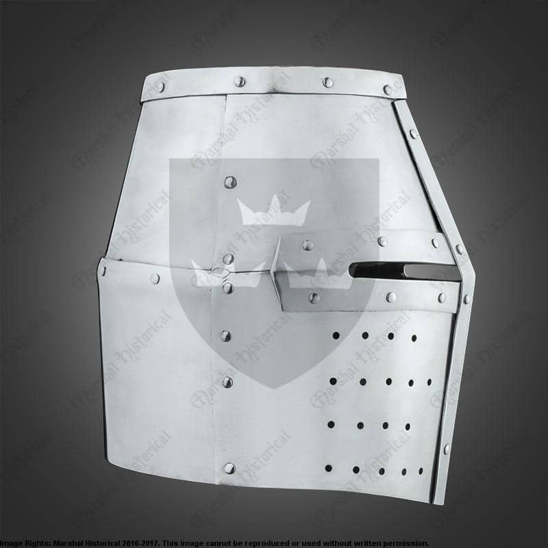 El yelmo, que comenzó a verse en el campo de batalla tan pronto como en el siglo XII en sus formas mas tempranas, resultó ser un diseño ganador que se usó casi durante los 3 siglos siguientes. Una pieza sencilla de fabricar y como su alargado uso demuestra, útil para la protección de la caballería. Normalmente llevado sobre el almófar de malla, o sobre un capacete o cervillera solía hacerse con 4 piezas remachadas entre si y con una calva plana. Solía tener un visor fijo, normalmente con un aspecto feroz que ayudaba a aumentar el ya de por si intimidante aspecto de un caballero a la carga.